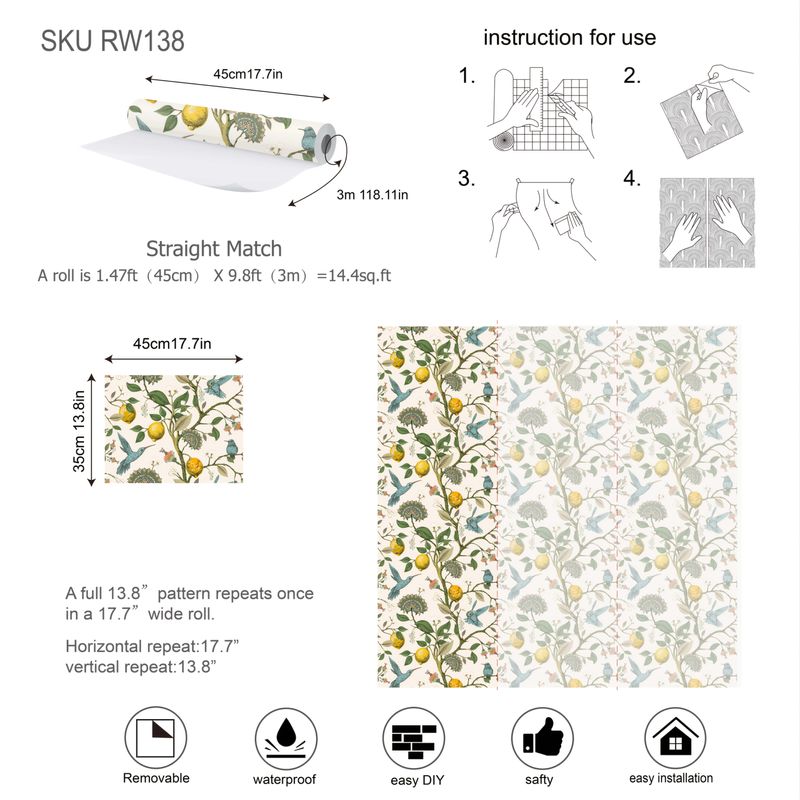 This beautiful self-adhesive wallpaper features an elegant black background with lovely bluebird and tree patterns, bringing a vintage and artistic atmosphere to your home. Measuring 17.7 inches by 118 inches, one roll is enough to decorate most wall areas or furniture surfaces.Designed with self-adhesive backing, it is easy to peel and stick without extra glue or professional tools. The removable material leaves no residue and will not damage your walls when taken off, making it perfect for renters and homeowners who love frequent changes.Waterproof, durable and easy to clean, it can be widely used in living rooms, bedrooms, as well as for refurbishing old cabinets, desks and other smooth surfaces. High-quality printing ensures clear patterns and long-lasting colors.Whether you want to create an accent wall or renew old furniture, this wallpaper is your ideal choice for quick and affordable home decoration.